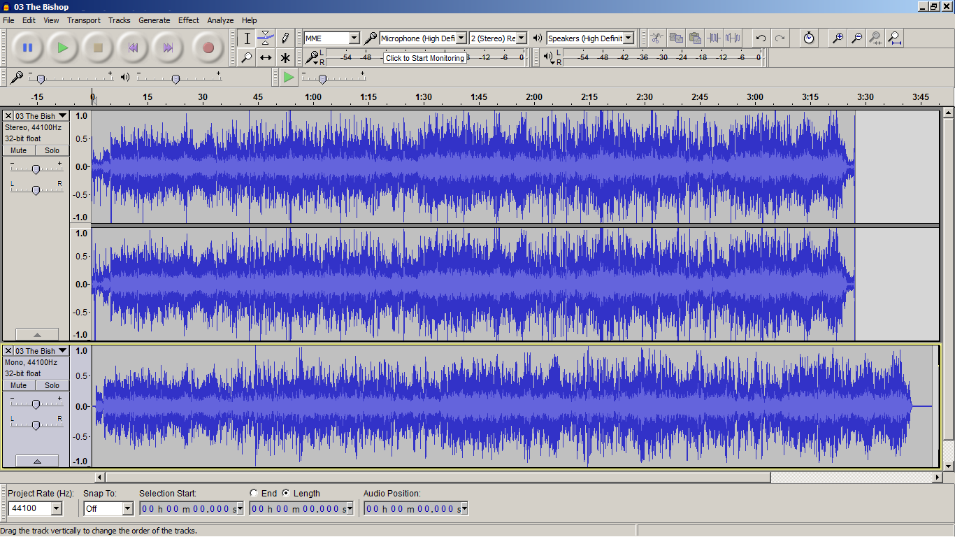 Tracks 1 & 2 originalTrack 3 after ClickRepair, Goldwave noise reduction, equalization & extension of duration. |
