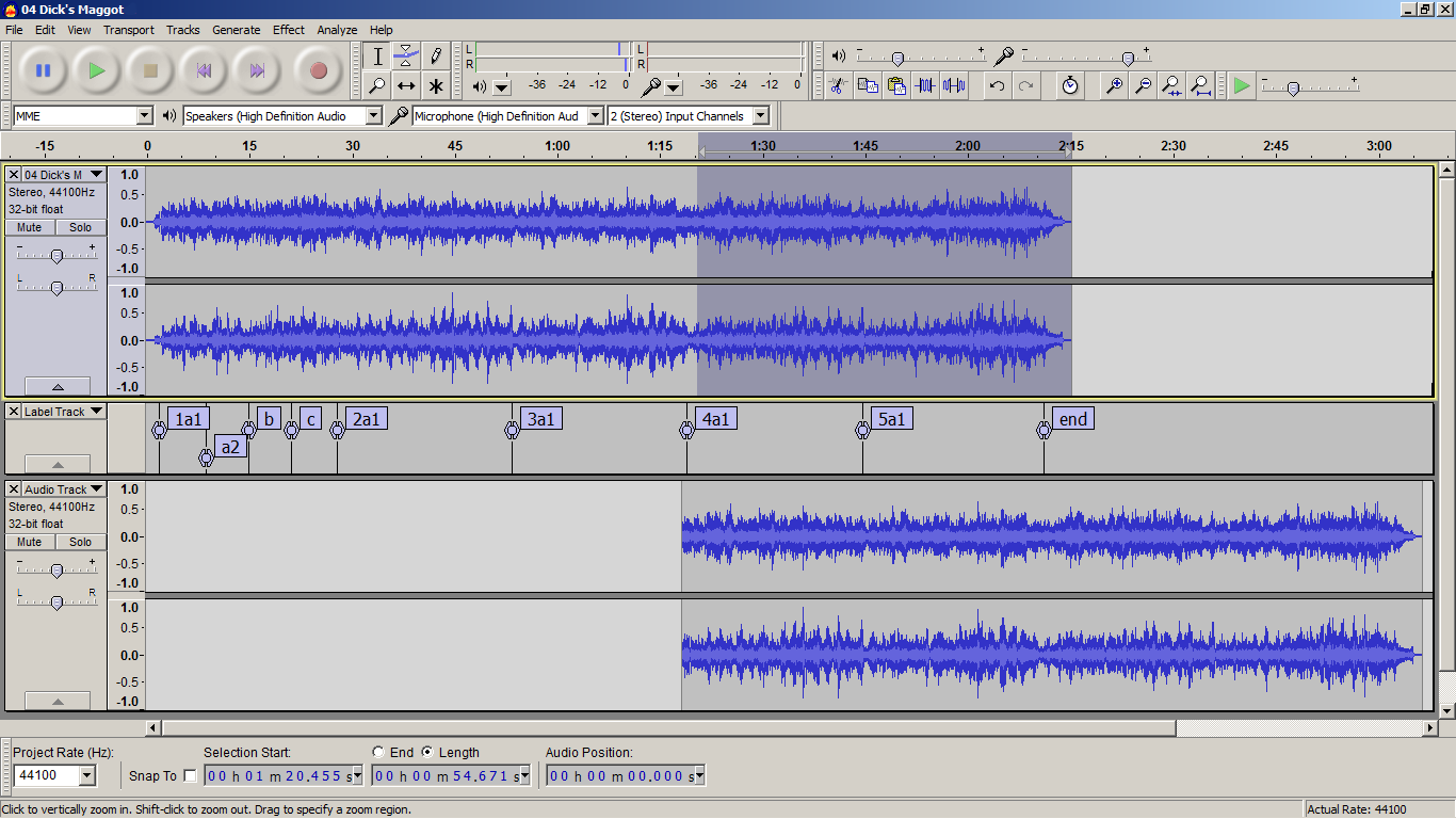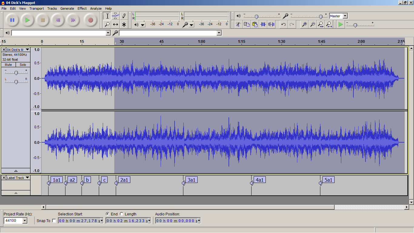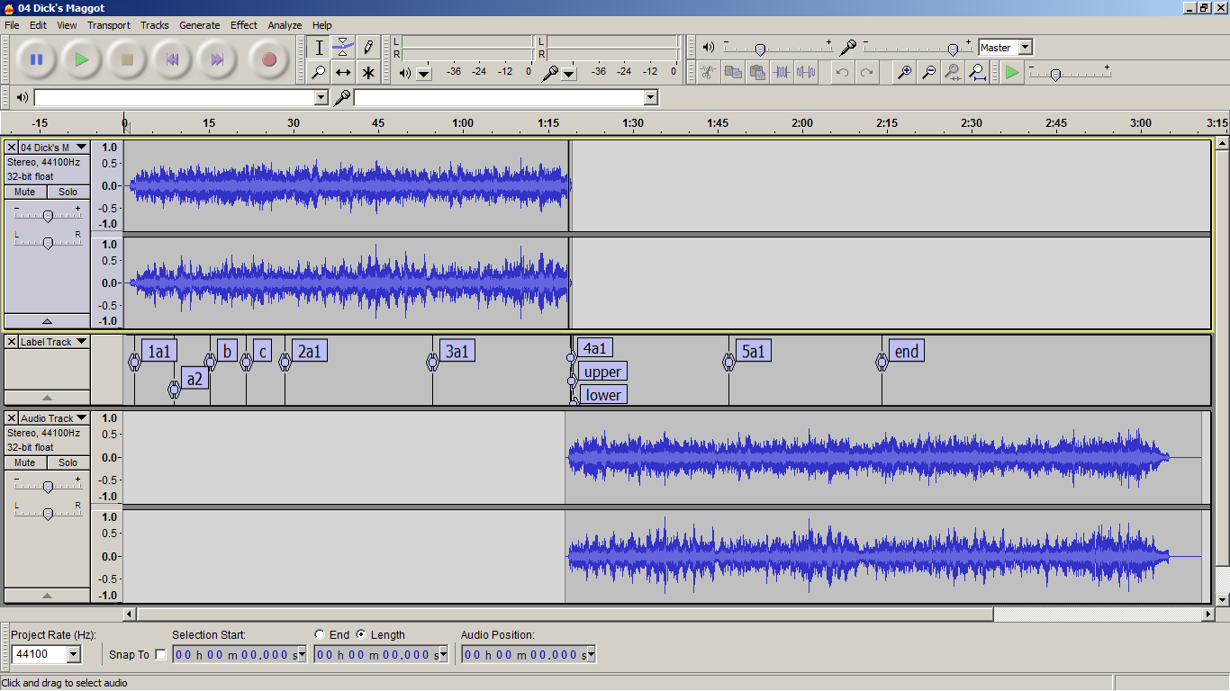 After completing noise reduction processing, either using Goldwave (as illustrated above) or by using similar facilities in Audacity, we now turn to dealing with another deficiency in the recording of Dick's Maggot. It is only 5×16 bars long, which is a bit short for dancing, while simply repeating the whole dance is likely to be too much. Note that the music is in 3/2 time and so dancers take 3 steps to the bar; once through the dance is 16 bars. We will therefore look at a means to extend the track to 7×16 bars. Audacity again presents the stereo tracks with the left channel at the top and the right channel below, but they are not coloured differently and the whole display is rather more muted than Goldwave. Having read the stereo audio into Audacity, we first add a "Label track". The easiest way to do this is to start listening to the music and when the first notable time in the music is reached press <ctrl>M . If there is not already a label track, then one will be inserted and a label placed at the time of the key stroke. The text insertion cursor remains in this newly opened label and we can type a description "1a1" to indicate that this is the start of the first occurence of the A1 four-bar phrase of music. When the repeat of this phrase begins we hit <ctrl>M again and type in "a2". We continue to insert labels for the start of the "b" and "c" phrases in this tune, and then "2a1" at the start of the second time through the whole 16-bars. The start of the other repeats are marked as "3a1", "4a1" and "5a1". We then have to decide which 2×16 bars in the recording we wish to be repeated. In this case, I chose those starting at "2a1" and "3a1", so I selected from a few seconds before the start of the "2a1" music all the way upto the end of the track. The selection is copied into the clipboard; this can be done from the drop down menus but the key stroke <ctrl>C is quicker. |