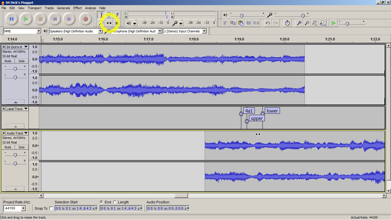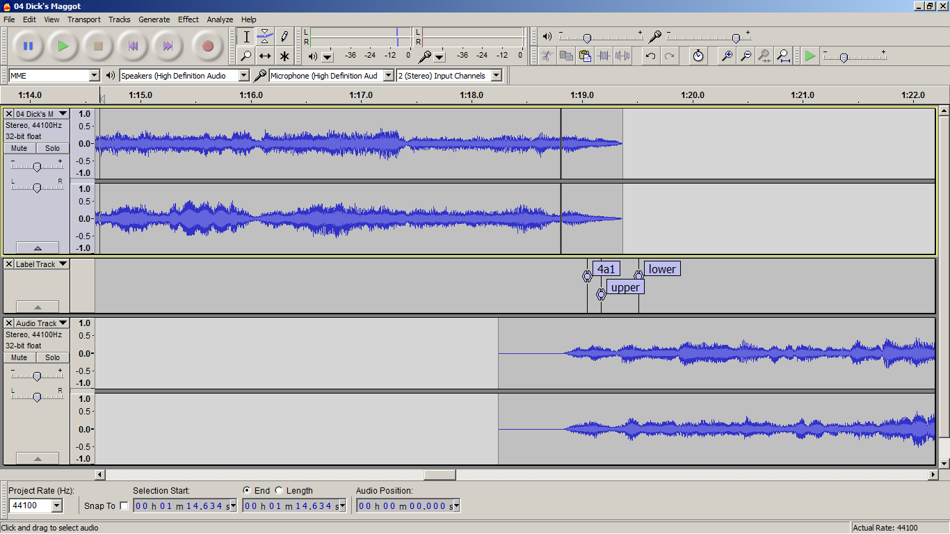 We next use Audacity's drop down menus "Tracks"→"Add New"→"Stereo Track"; this facility in Audacity is an extremely valuable capability. Position the cursor a few seconds before the "4a1" label in this new track, and paste a copy from the clipboard; <ctrl>V is the shotcut key stroke to do this. Returning to the original upper stereo track, we select the interval from a few seconds after the "4a1" label upto the end of that track, and delete (by pressing the Delete key). |