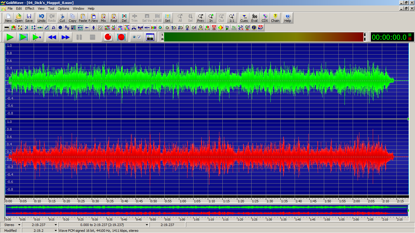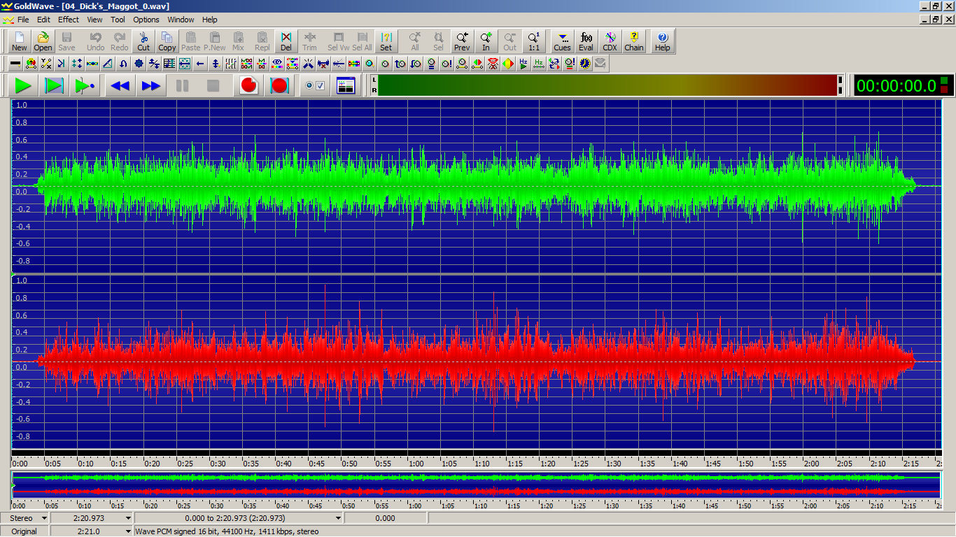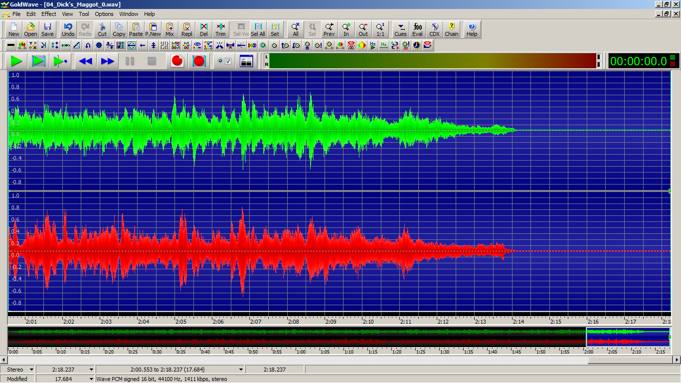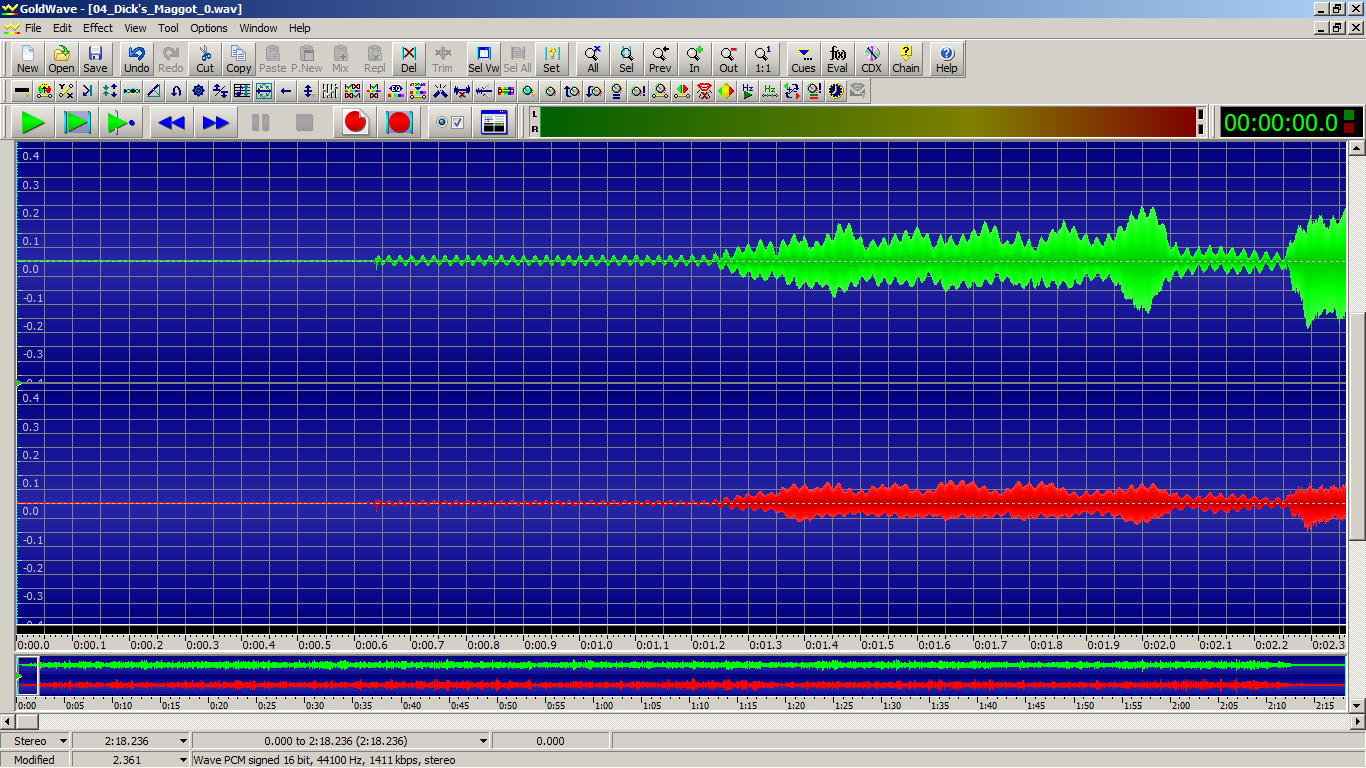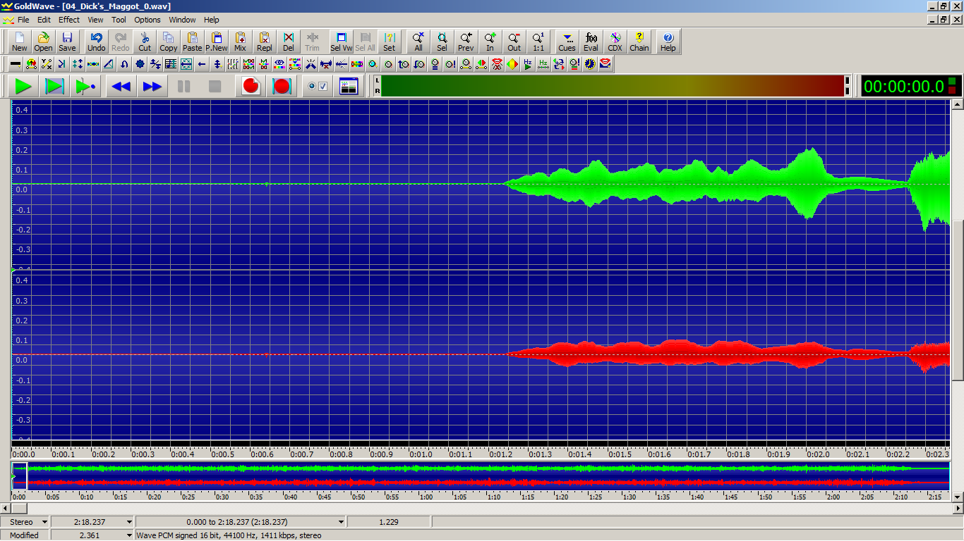 When the "wav" file for the 4th track that we recorded is read into GoldWave, the initial display shows the time histories of the signals (which were originally air pressures) for the pair of channels: left channel at the top in green, right channel below in red. All the subsequent processing is applied simultaneously to both channels by the software. |