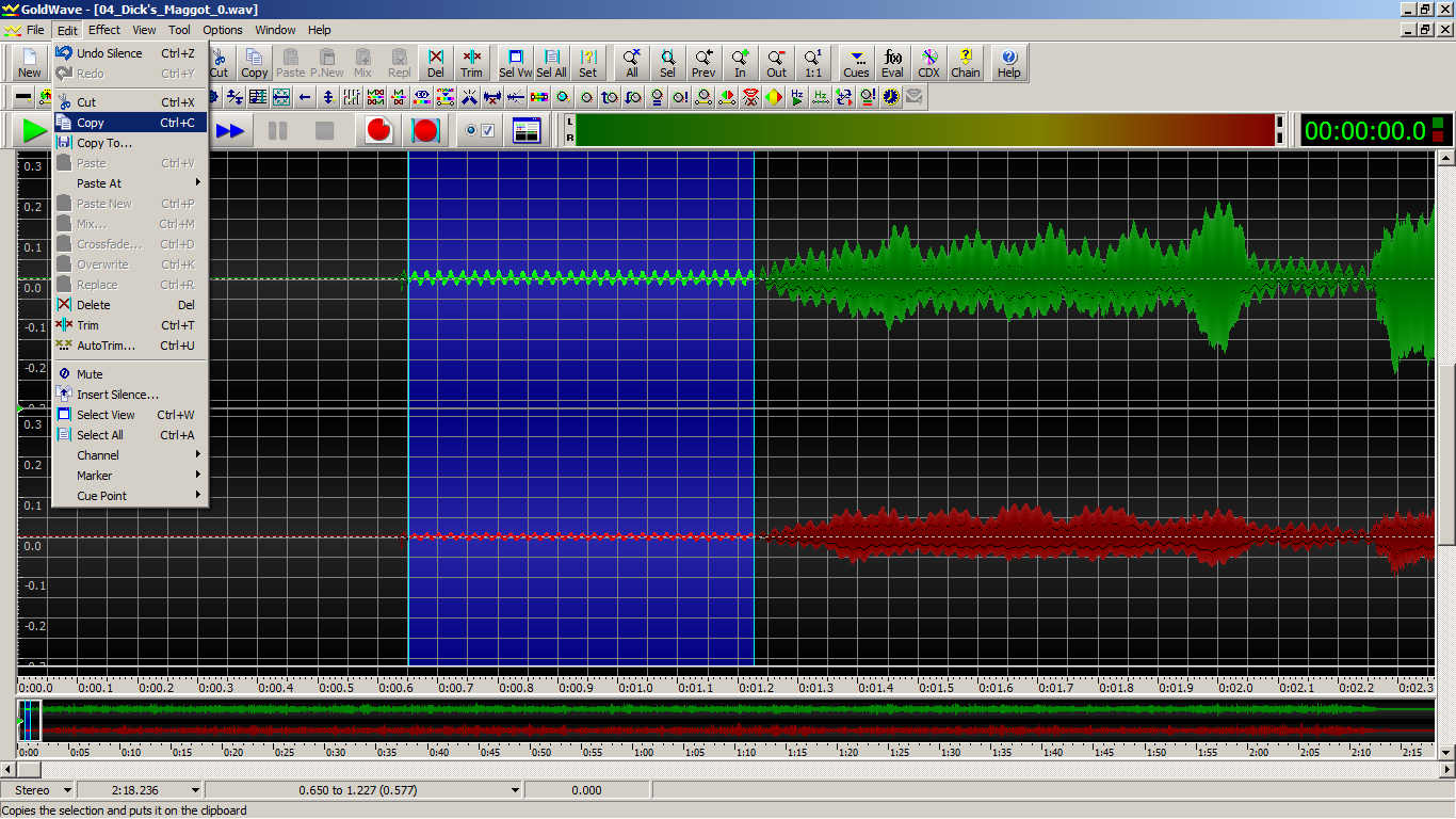 To attempt to remove the noise from the recording, we first select a sample of the noise and copy it to the clipboard. The copy operation can be done through the drop-down menus (as shown here), but the keyboard shortcut <ctrl>C is convenient. |