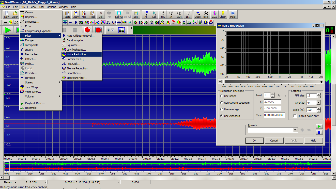 Before moving into the noise reduction facility it is vital to extend the selection to encompass the whole track. The quick way to do this is to use the keyboard shortcut <ctrl>A Without doing this, noise will only be removed from the 0.577 seconds that was selected to characterise the noise; not a very useful operation! The drop-down menus are then used to reach the "Noise Reduction" control box. Here the only change that has to be made is to select "Use clipboard" from the "Reduction envelope" options before pressing "OK". |