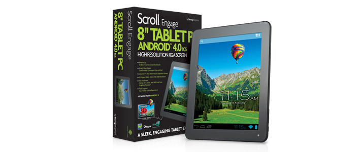 The Scroll Engage offers the very latest android technology in a convenient, stylish form. The handy 8" screen and svelte, lightweight design makes the Engage ideal for use on the go and really sets the device apart. Convenience does not come at the cost of quality, not only does the Engage pack the latest Android 4.0 (Ice Cream Sandwich) operating system but a high resolution (1024 x 768) XGA screen and vast multimedia support ensures that the tablet provides high quality media content no matter where you are. A sleek aluminium finish adds a touch of class and the feel of quality to this most engaging of devices.